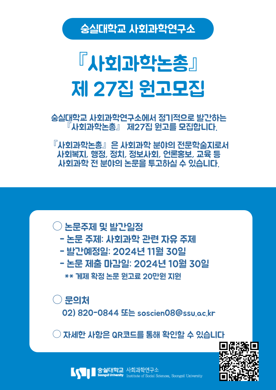 숭실대학교 사회과학연구소에서 정기적으로 발간하는 『사회과학논총』 제27집 원고를 모집합니다.